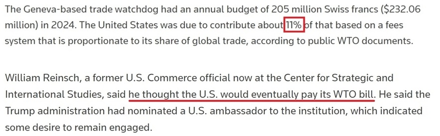 美国商务部前官员、现就职于美国计谋取国际问题研究核心的威廉·赖因施认为,美国最终会缴纳世贸组织会费,由于特朗普曾经提名了美国驻世贸组织代表,这表白美国但愿继续留正在该组织中。